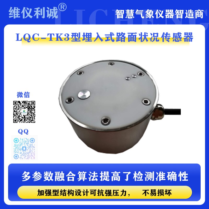 LQC-TK3型埋入式路面状况传感器能够实时监测路面温度、结冰点温度、水膜厚度及路面冰水雪干等道路状况,本产品实现了多传感器批量化制备技术、系统集成开发和路面气象条件的预警算法技术,应用领域包括路面气象环境监测、交通路面状况观测和无人值守路面气象观测站,在高速公路及高等级公路、高速铁路、城市内环城高速、桥梁、高架、机场跑道等场合有着广泛的用途。本系统主要技术指标与国外的LUFFT、Vaisala公司主流产品相比,部分指标持平,部分指标有所超越,总体指标能够达到高水平。