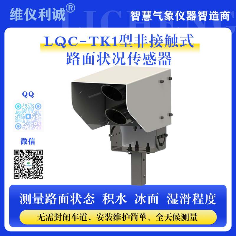 LQC-TK1型路面状况传感器是一款非接触式路面状态检测器,它采用遥感技术,避免了对道路的破坏,从而不会因为安装道路气象站引起的对交通的干扰。多光谱测量技术使得能准确检测出道路表面结冰、积雪和积水的厚度。在埋入式路面传感器不便或不能安装的路面条件下,LQC-TK1型路面状况传感器是理想的选择。遥感安装,意味着不需要封闭道路、不需要切割路面,安装工作既安全又方便。维护量少,是道路气象系统组成中一项理想选择。它既可以安装在现有的气象站上,也可以安装在路面视野无遮挡的其他建筑物上。被安装在一个全天候、耐久的外壳中,以保证承受恶劣天气,这使得它在各种天气条件下能提供精准数据。通过提供路面条件信息,为道路管理部门提供准确的监测数据,在道路安全出现险情之前,采取响应措施。